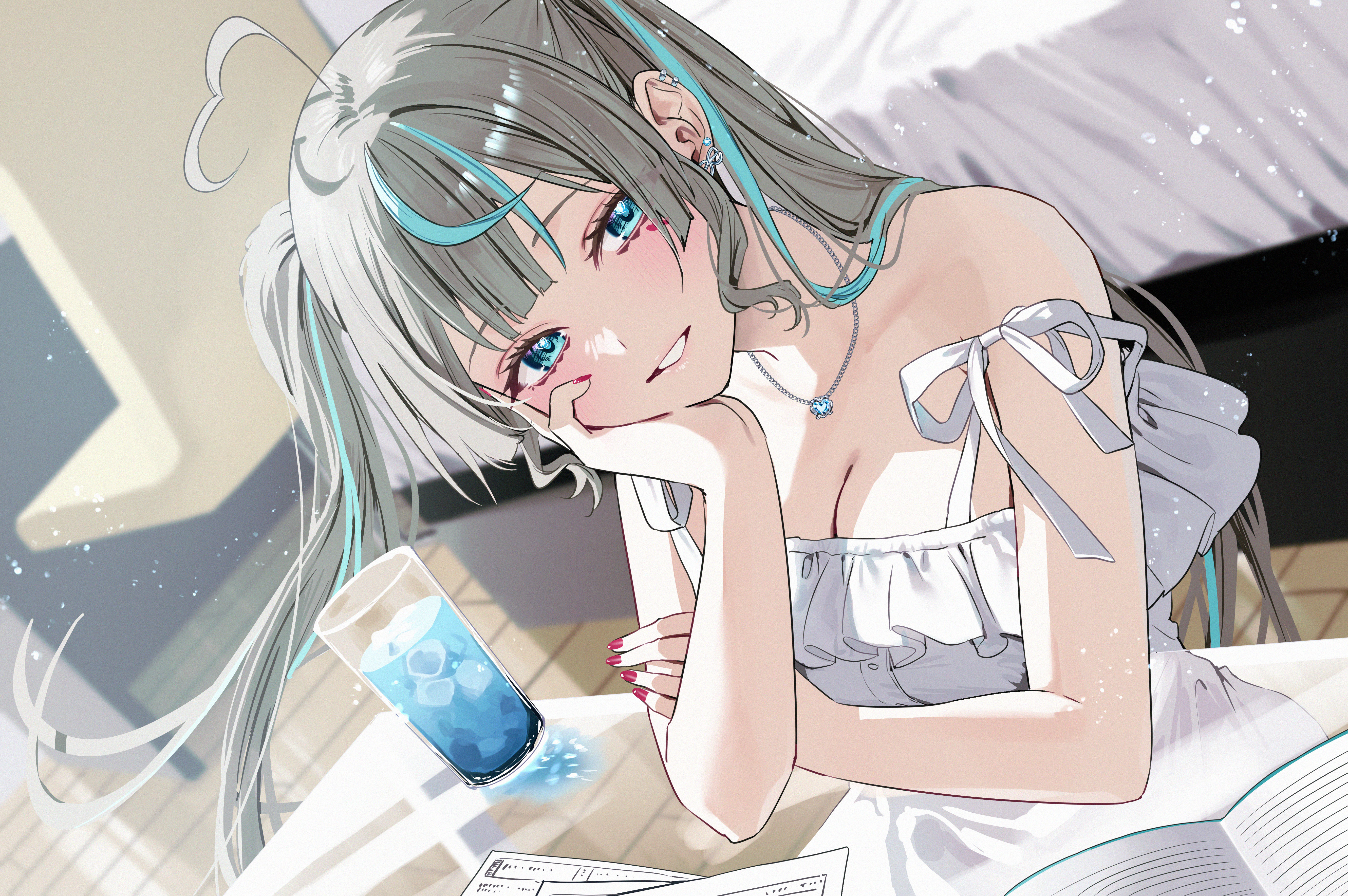 1girlahogeaqua hairbedblunt bangsblushbookbreastscleavagedressglassgrey hairgrinhead on handheartheart ahogeiceice cubeindoorsjewelrylong hairlooking at viewermedium breastsmulticolored hairnecklaceopen bookopen mouthpaperred nailssidelockssittingsmilesolostreaked hairtableteethtwo-tone hairwhite dresswooden floor