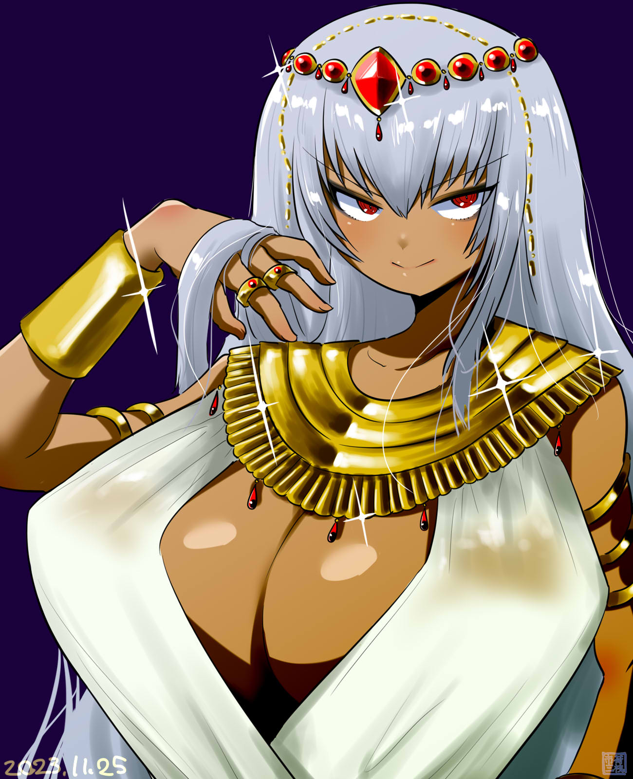 1girlalternate breast size (larger)alternate costumealternate skin colorancient egyptianancient egyptian clothesblushbreastscircletcleavagedark skindark-skinned femaledatedgemgold necklacegrey hairhuge breastsjewelrylong hairlooking at viewernecklaceopen mouthpurple backgroundred eyesred gemstoneringsimple backgroundsmilesoloupper bodyv-shaped eyebrows