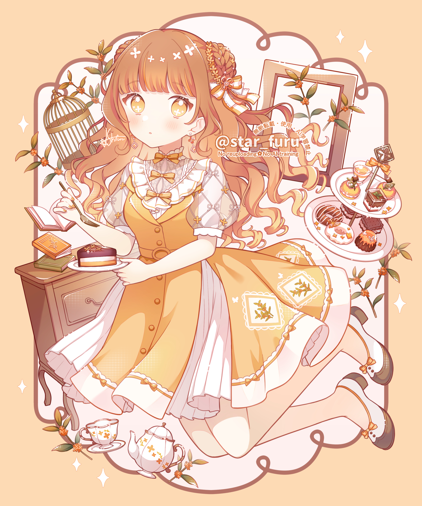 :o1girlbirdblushbookbordercakecake slicechest of drawerscupdonutdouble bundressfoodforkgold osmanthushair bunholdingholding forkholding platelooking to the sideorange backgroundorange dressorange eyesorange hairorange themepicture frameplatepuffy short sleevespuffy sleevessaucersee-through clothessee-through sleevesshoesshort hairshort sleevessimple backgroundsoloteacupteapottiered traywavy hairwhite backgroundwhite dresswhite shoes