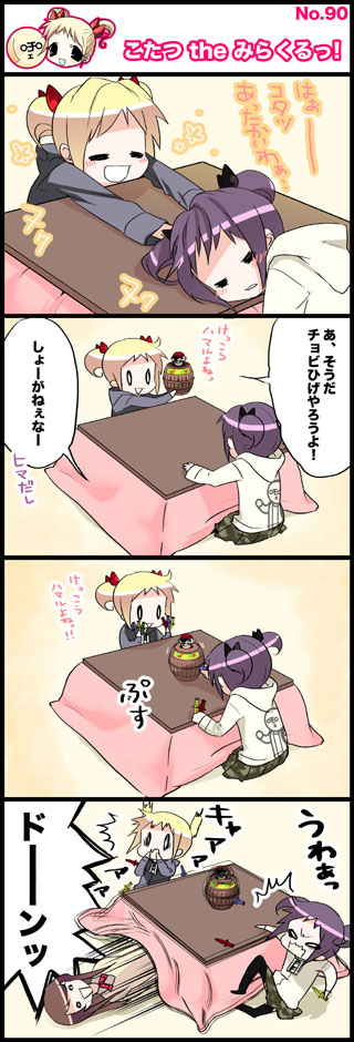 comwoooo, tatara kogasa, touhou, absurdres, commentary request, highres, +++, 1girl, :d, blue eyes, blue hair, blue skirt, blue vest, blush, bright pupils, full body, geta, head tilt, heterochromia, holding, holding umbrella, juliet sleeves, long sleeves, long tongue, looking at viewer, medium hair, open mouth, puffy sleeves, purple umbrella, red eyes, shirt, signature, skirt, smile, solo, standing, standing on one leg, toes, tongue, umbrella, very long tongue, vest, white pupils, white shirt