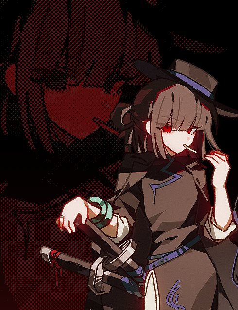 1girlalternate hairstyleblack coatblack dressblack hairblack hatchina dresschinese clothescigarettecinq association east uniformcoatcoat on shouldersdresshatjade braceletlooking at viewerred backgroundred eyesshort hairsimple backgroundsmokingsolostandingtilted headwearupper body