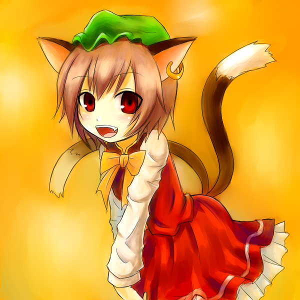 1girlanimal earsbrown haircat earscat girlcat tailearringsfangfemale focusgradient backgroundhatjewelrymultiple tailsred eyesribbonsolotail