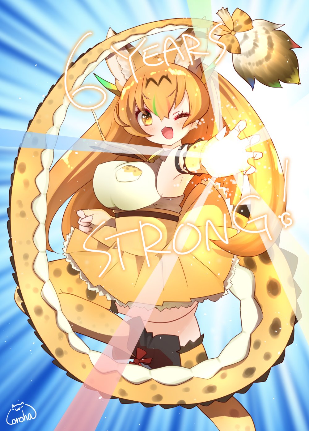 1girlanimal earsarm uparmpitsbeltblonde hairblue backgrounddragon serval (kemono friends)elbow glovesextra earsgloveshornslong hairlooking at viewernecktieone eye closedribbonshirtshoessimple backgroundskirtsleevelesssleeveless shirtsolotailthighhighsyellow eyes