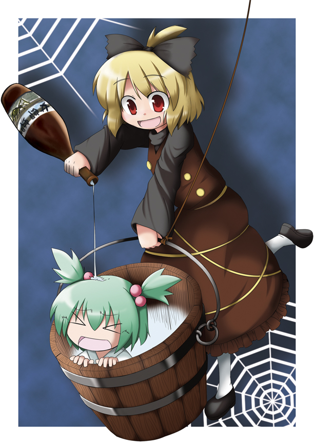 1boy2girlsblonde hairbottlebowbucketclosed eyesfemale focusgreen hairhair bobbleshair ornamentin bucketin containermultiple girlsred eyesshort hairsilkspider webtwintails