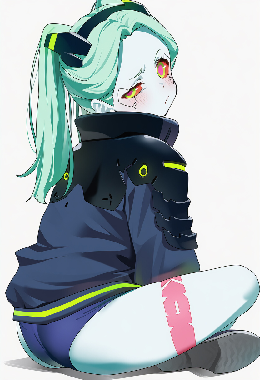1boy1girlartificial eyeassbare shouldersbraclosed mouthcolored scleracolored skincrossed legscyborgfull bodygreen eyesgreen hairlong hairlooking at viewerlooking backmechanical eyeneck tattoopink tattoored pupilsred sclerasimple backgroundsolostomach tattoostraplessstrapless bratattootwintailsunderwearunderwear onlyupper bodywhite skinwide hips