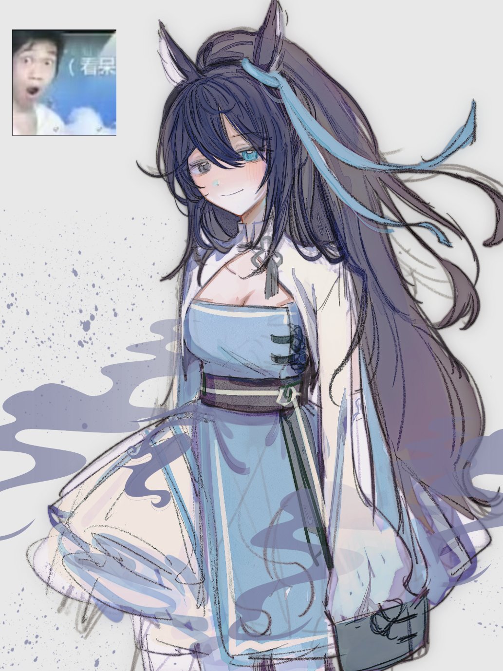 1girlanimal earsblack eyesblack hairblue dressblue eyesblue ribbonbreastscleavagedressgenderswapgenderswap (mtf)grey sashheterochromiahigh ponytailhorse earshorse girllong hairlooking at viewerponytailribbonshrug (clothing)simple backgroundsleeves past fingerssleeves past wristssoloupper bodyvgh3pncsgb22169white backgroundwhite shrug