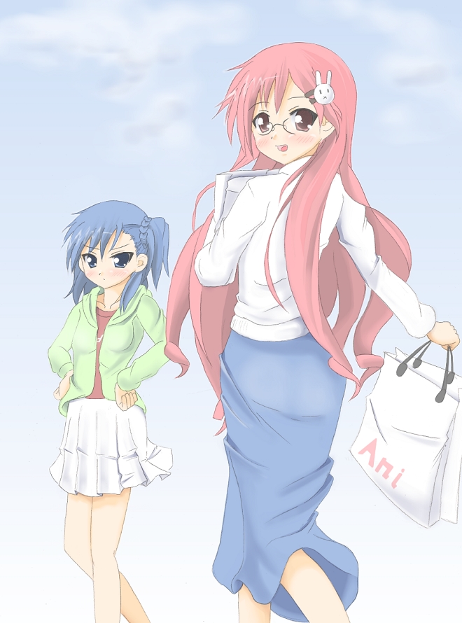 00s10s2girlsblue eyesblue hairglasseslong hairmultiple girlspink eyespink hairshort hairsiblingsside ponytailsisters