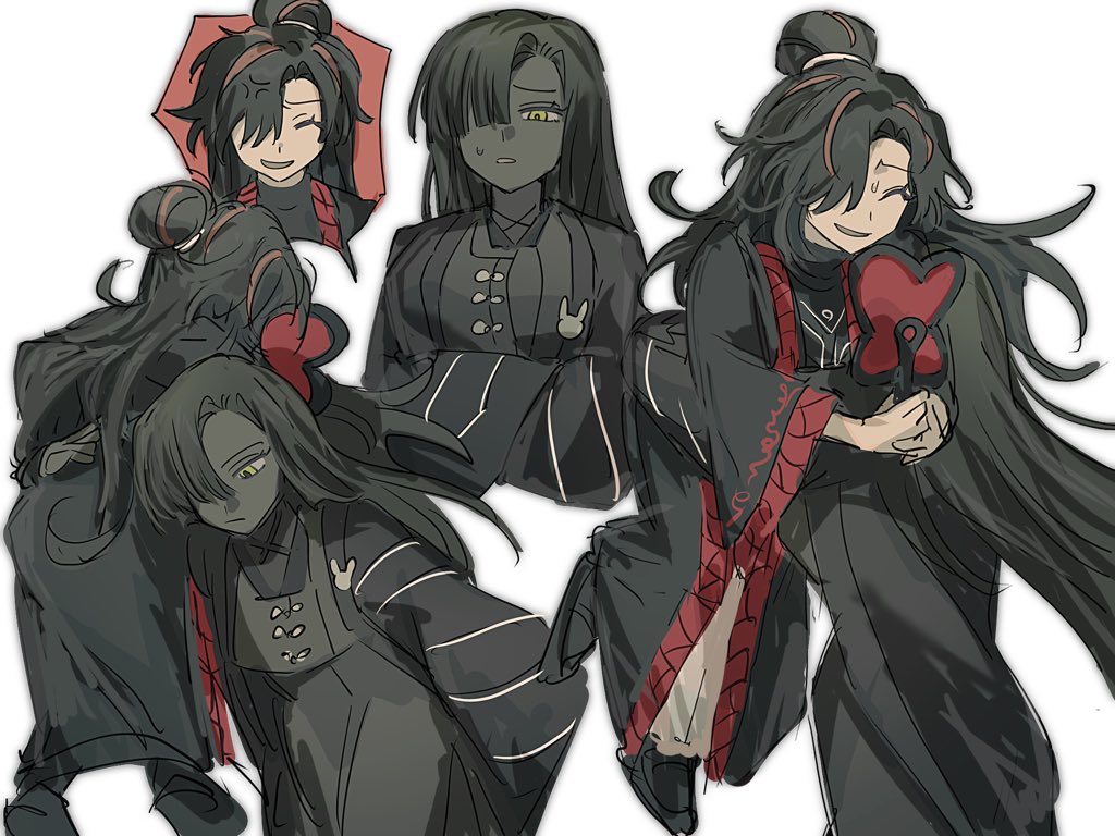 2girlsanger veinblack hairblack hanfuchinese clothesclosed eyesdark skindark-skinned femalefull bodyhair bunhair over one eyehand fanhanfuholdingholding fanlong hairlong sleeveslooking at viewermulticolored hairmultiple girlsmultiple viewsrabbit pinred streakssimple backgroundstandingstreaked hairupper bodywhite backgroundyellow eyes