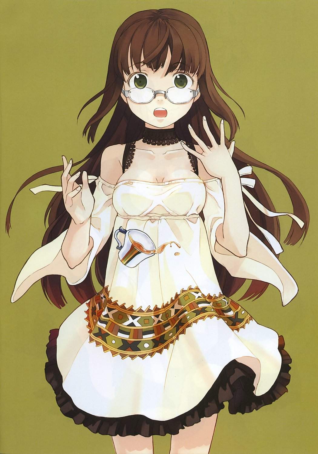 1girlbreastsbrown hairdressfemale focusglassesgreen eyeslong hairmedium breastsopen mouthsolosurprised