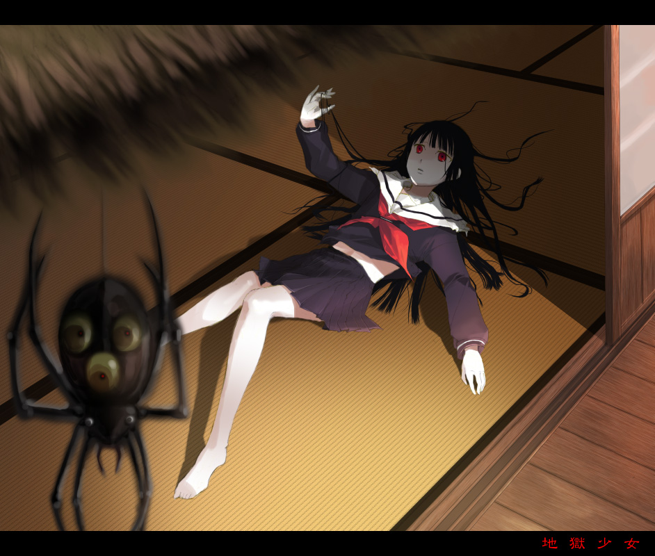 00s1girlbarefootblack hairblack serafukublunt bangsbugfemale focusfusumahime cutletterboxedlong hairlyingmidriffred eyesschool uniformserafukushoujisliding doorssolospidertatami