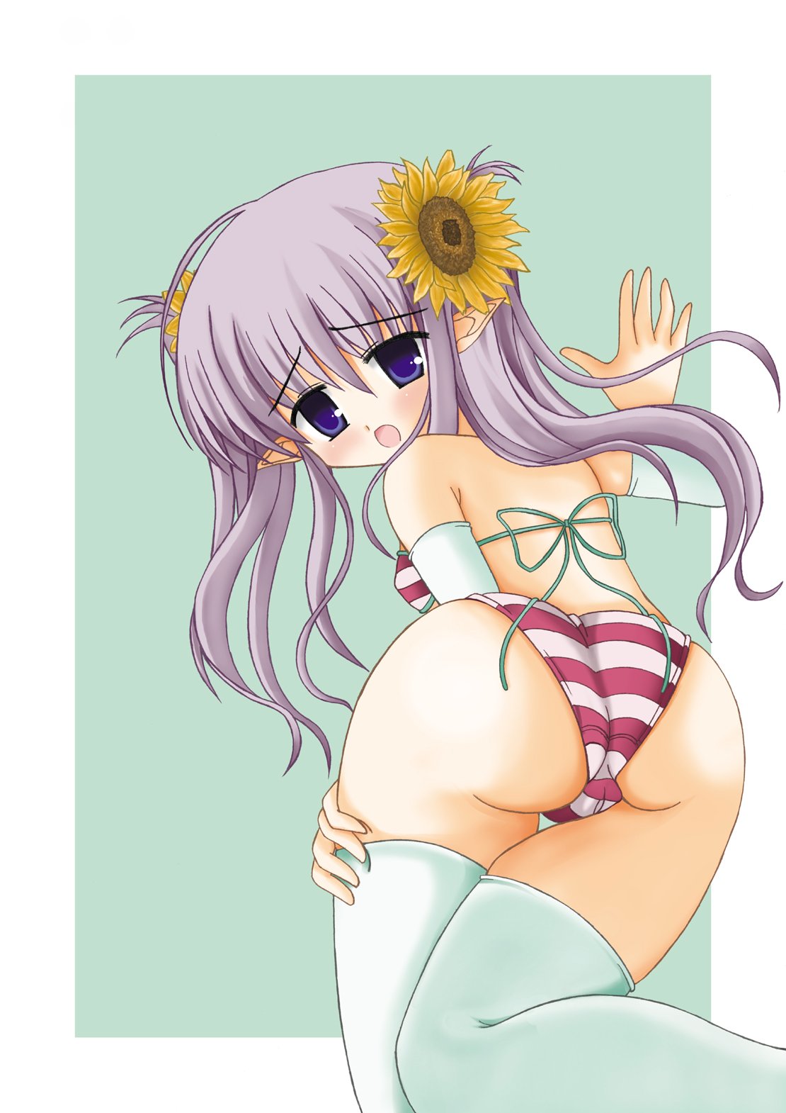 00s1girlassbad anatomybent overbikiniblue eyesblushdetached sleevesfemale focusflat chestflowerfrom behindhair flowerhair ornamentlong hairlooking backopen mouthpointy earssolostriped bikinistriped clothessunflowerswimsuitthighhighswhite thighhighs