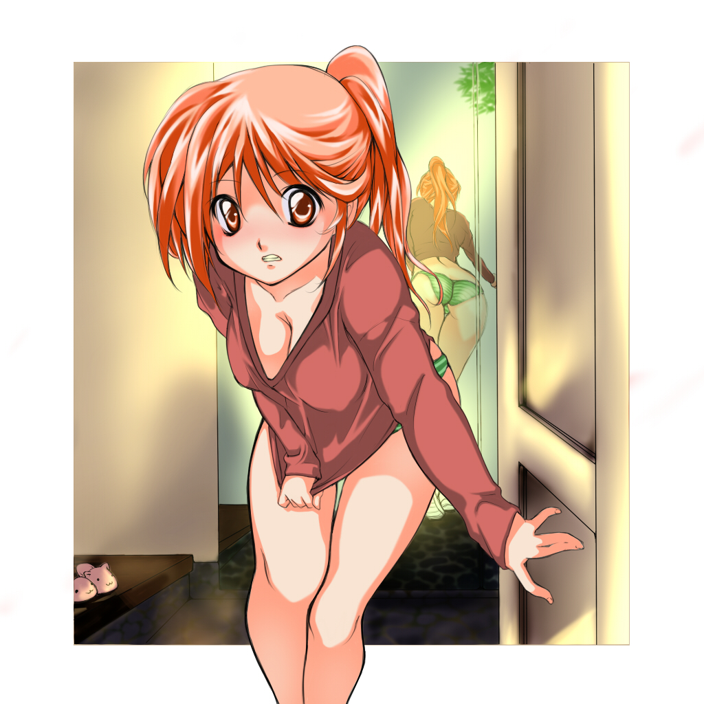 1girlanimal slippersassblushbreastscat slipperscleavagefemale focuslarge breastslong hairmirrorpantiesred eyesred hairsolostriped clothesstriped pantiesunderwear
