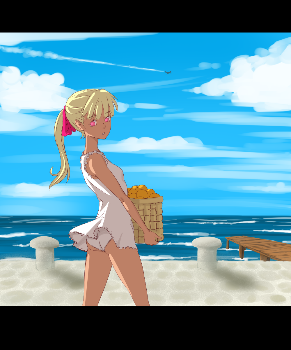 1girlbeachblonde hairclouddayfemale focusletterboxedoutdoorspantiespink eyesponytailskysolounderwear