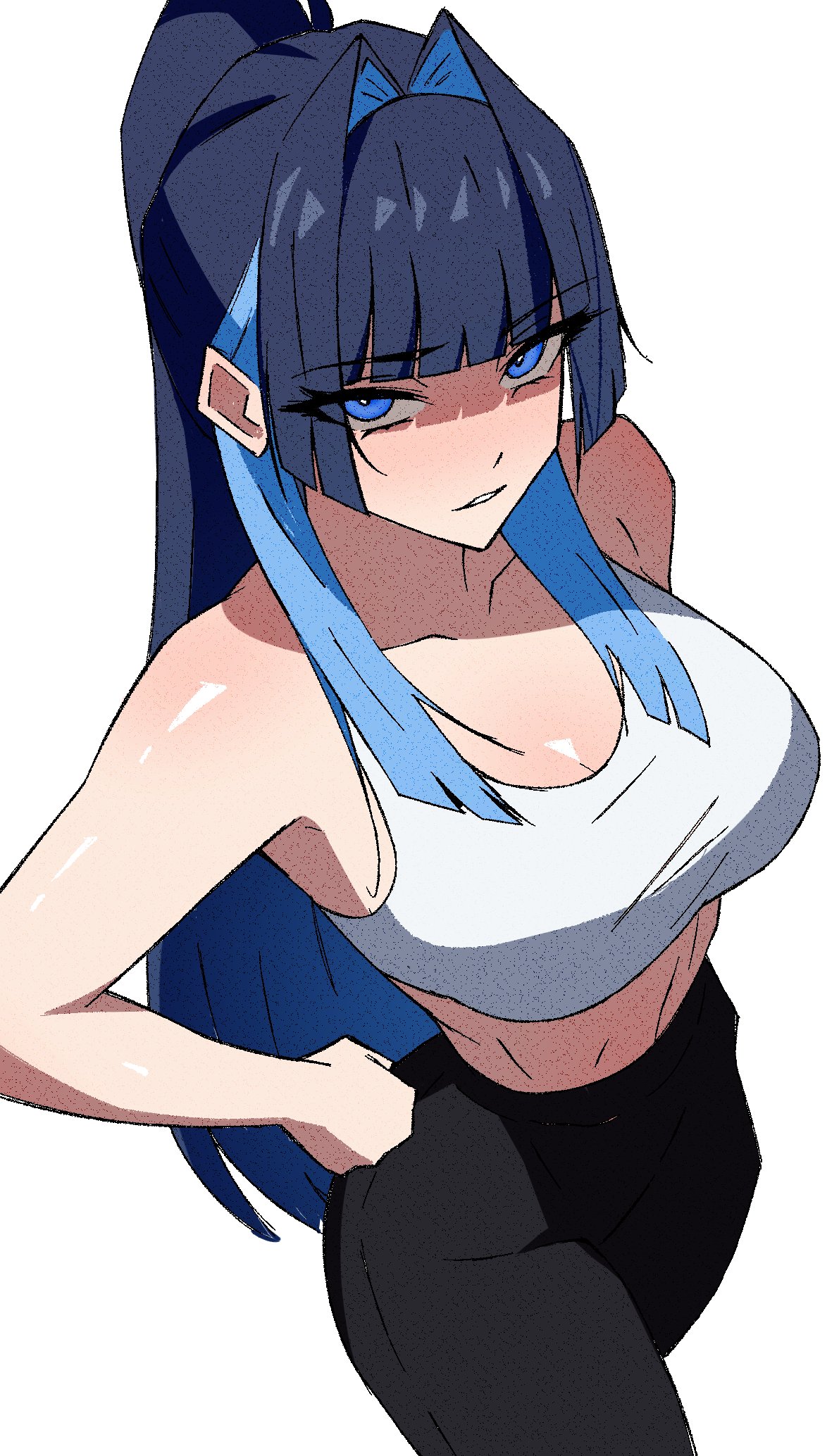 1girlblack pantsblue eyesblue hairbreastshair intakespantsritorugalaxysimple backgroundsolosports bravirtual youtuberwhite backgroundwhite sports bra