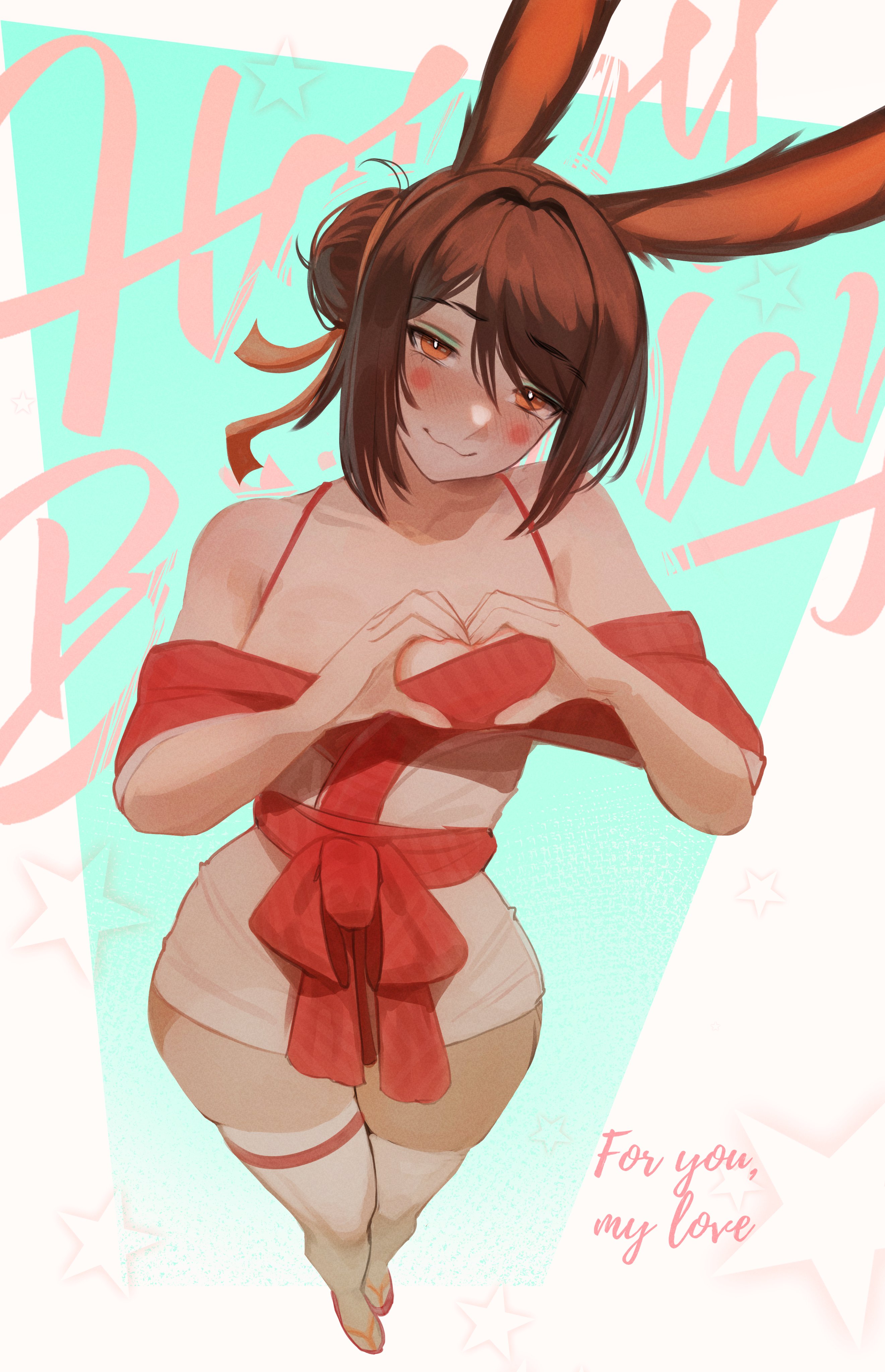:31girlanimal earsbare shouldersblushborrowed characterbreastsbrown haircollarbonedressenglish textfacial markfull bodyhair bunhair ribbonhappy birthdayhead tiltheartheart handsheart-shaped boob challengelooking at viewermedium breastsoff shoulderoff-shoulder dressrabbit earsred ribbonred sashribbonsandalssashsimple backgroundsingle side bunsmilesolothighhighswhite dresswhite thighhighswide hipszettai ryouiki