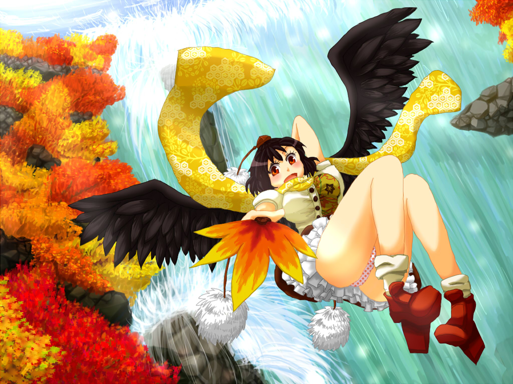 1girlautumnblack hairblack wingsfemale focusflyinggetahand fanhatlooking at vieweropen mouthpantiesscarfshort hairskirtsmilesolotengu-getaunderwearwaterwaterfallwings