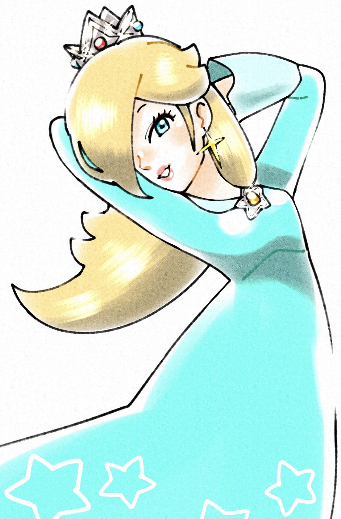 1girlarms behind headblonde hairblue dressblue eyesbroochcrowndressearringseyelasheshair over one eyejewelrylong hairlong sleeveslooking at viewersmilesolostar (symbol)star broochstar earringswhite background