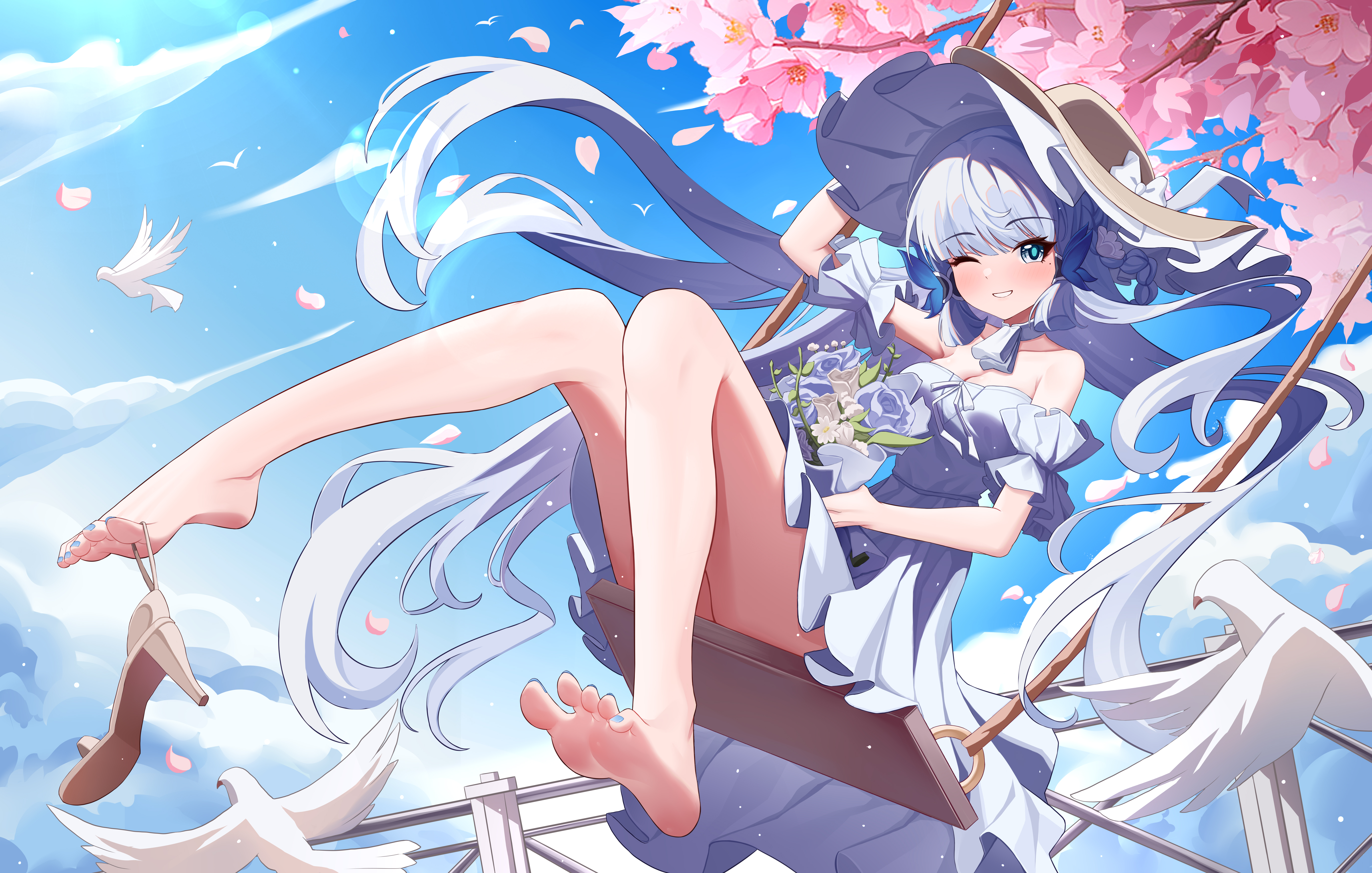 1girlalternate costumebare shouldersbarefootbirdblue dressblue eyesblue flowerblue hairblue nailsblue pupilsblue skybouquetbreastscherry blossomsclouddressfloating hairflowerfrilled hatfrillsfull bodyhathigh heelsholdingholding bouquetlong hairlooking at viewermedium breastsnail polishon swingone eye closedpetalspink petalsshoesskysmilesoloswingtoenail polishtoenailsunworn shoeswhite flower