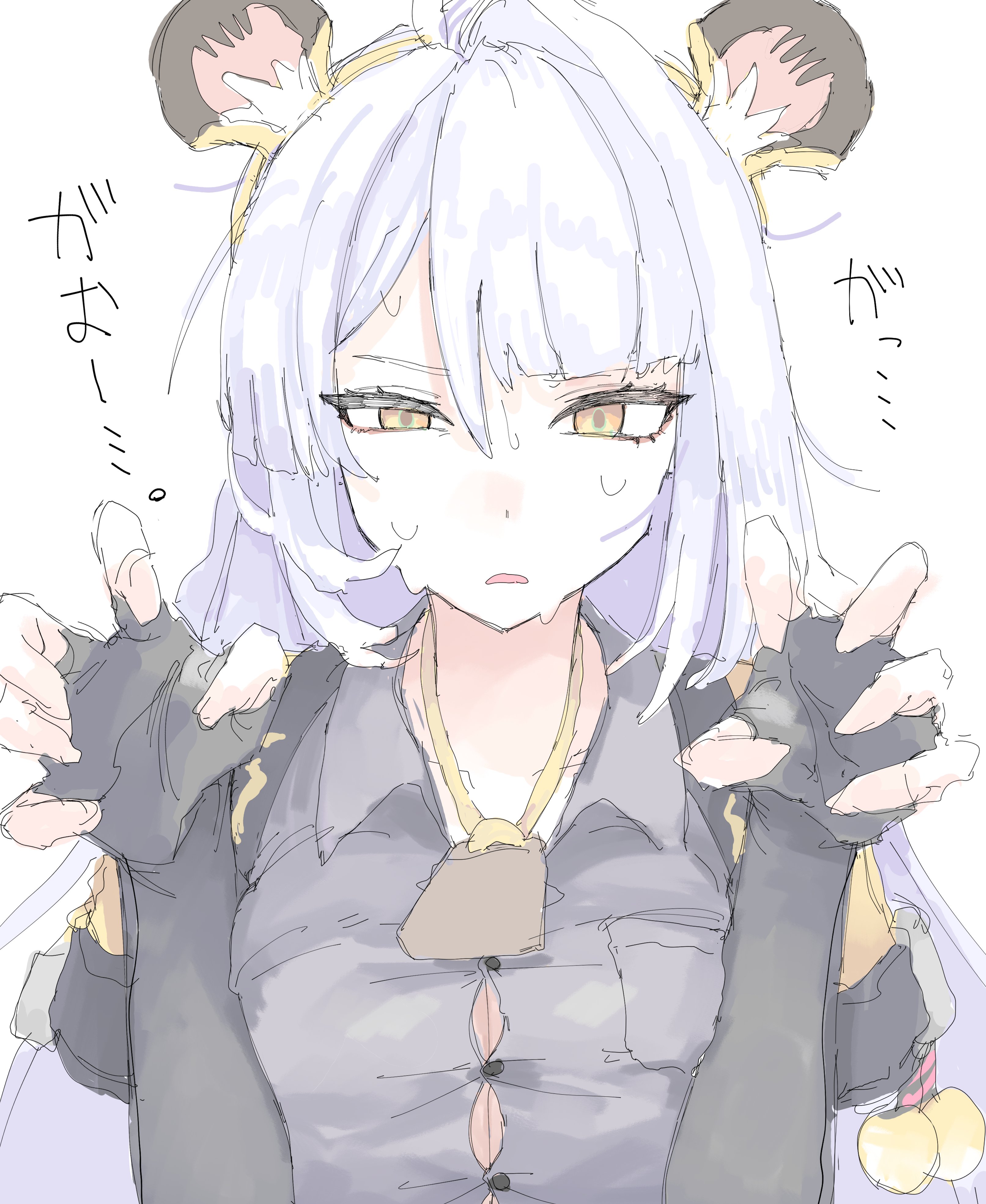 1girlalternate costumeanimal ear fluffanimal ear hairbandanimal earsblack glovesblack sleevesbreastsclaw posecleavagecosplaycostume switchfake animal earsfingerless glovesglovesgrey shirthairbandhalf-closed eyejacketlong hairlooking at viewermedallionopen mouthshirtsolosweattiger earswhite backgroundwhite hairyellow eyesyellow jacket