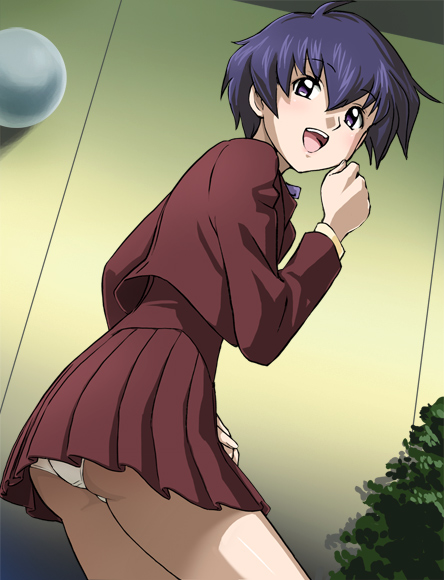 1girlassblue hairfemale focuspantiespantyshotpurple eyesschool uniformserafukushort hairsolounderwearupskirt