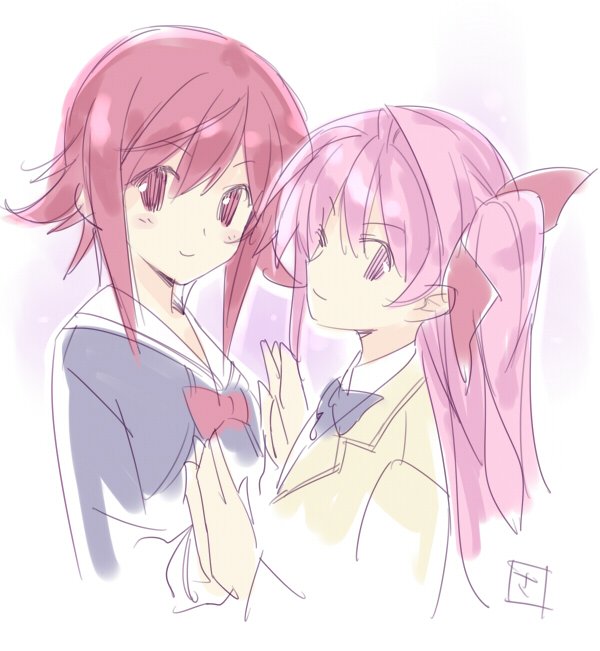 2girlsblushbowclosed mouthhair ribbonhekiho academy school uniformholding handslong hairlong sleeveslooking at viewermultiple girlspink eyespink hairribbonschool uniformshort hairsketchsmilesuimei academy school uniformupper body