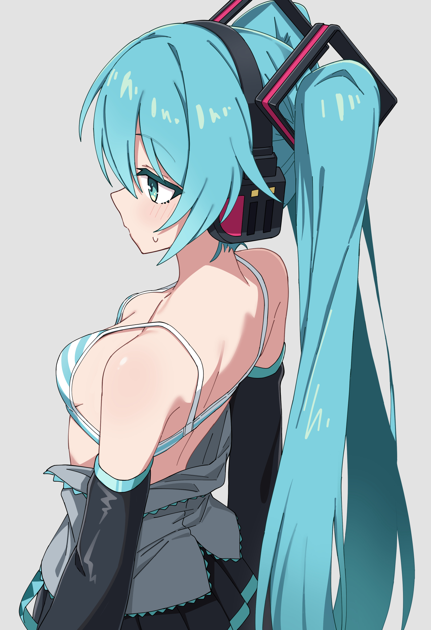 1girlbare shouldersbikiniblack skirtblack sleevesblue bikiniblue eyesblue hairblushclosed mouthdetached sleevesfrom behindgrey backgroundgrey shirtlong hairlong sleevesoff shoulderpleated skirtshirtsimple backgroundskirtsolostriped bikinistriped clothessweatdropswimsuittwintailsupper body