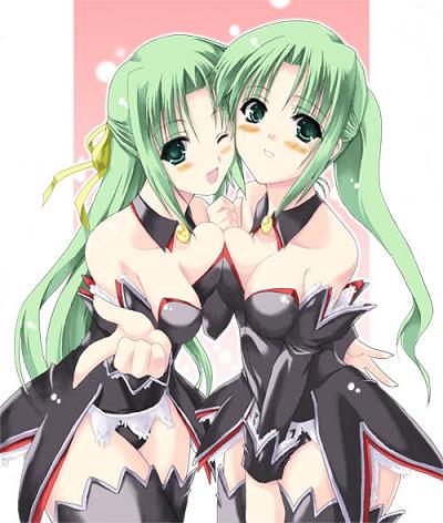 00s2girlsangel mortblushbreast pressbreastscleavagecoverdetached collargreen hairhalf updoincestmultiple girlssiblingssisterssymmetrical dockingthighhighstwins