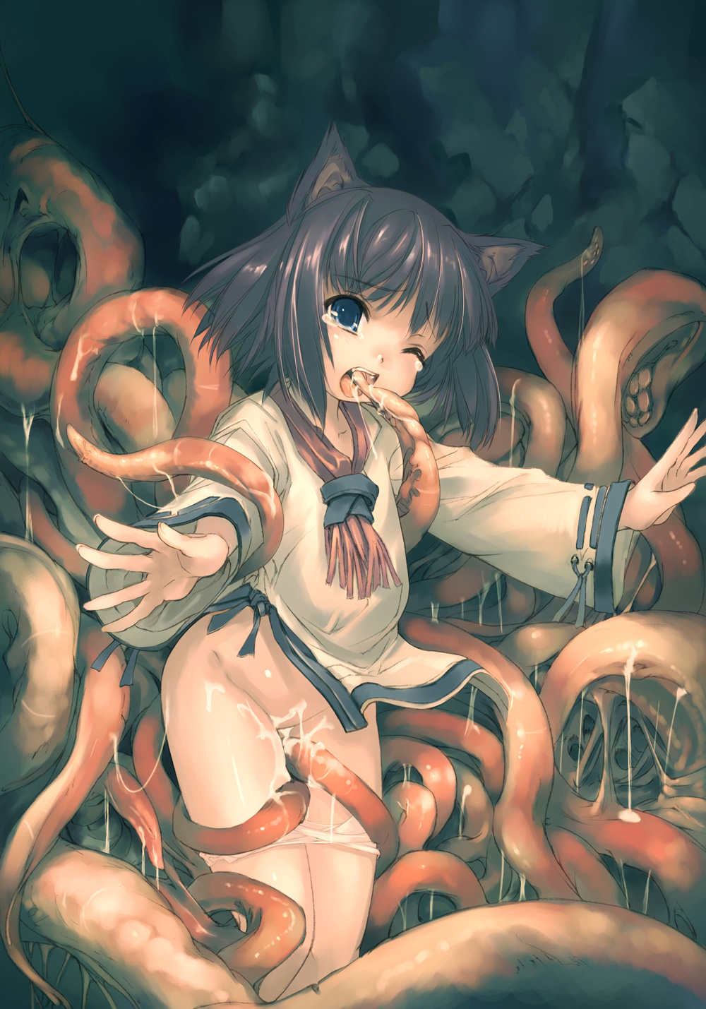 1girlanimal earsblack hairblue eyesbottomlesscat earscat tailclothes liftcumcum in mouthcum on bodycum on lower bodycum on tonguefangloliopen mouthoralpantiespanty pullrapeshort hairskirtskirt lifttailtearstentacle sextentaclesunderwear