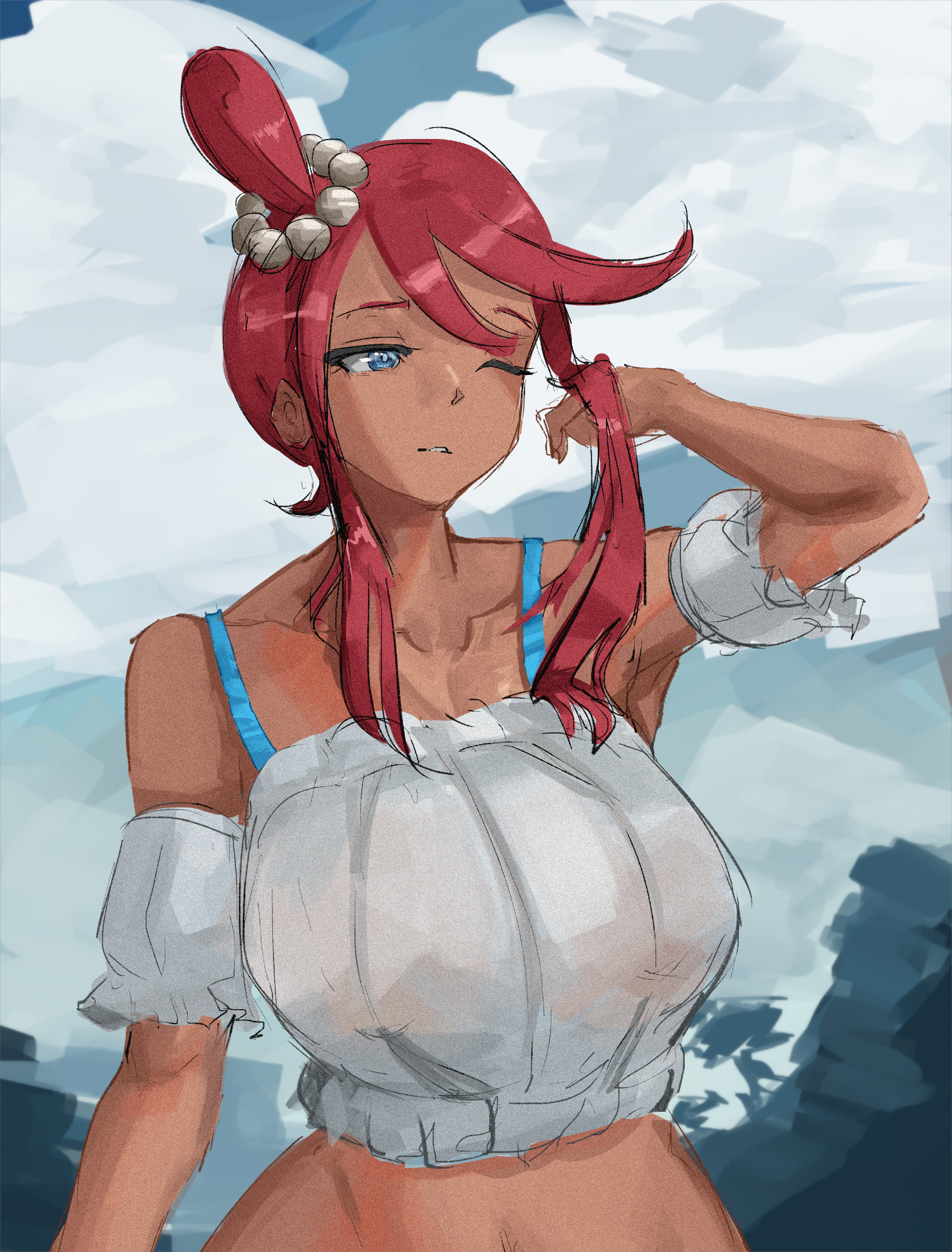1girlbare shouldersblue eyescloudcrop topdark skindark-skinned femaledetached sleeveslong hairone eye closedred hair