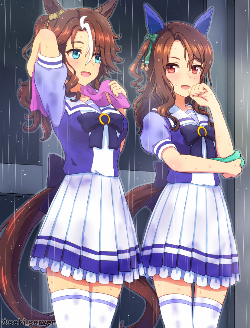 2girlsanimal earsblue eyesbrown hairear covershorse earshorse girlhorse tailmultiple girlsrainred eyessailor collarschool uniformsmiletailthighhighstracen school uniformwhite thighhighs