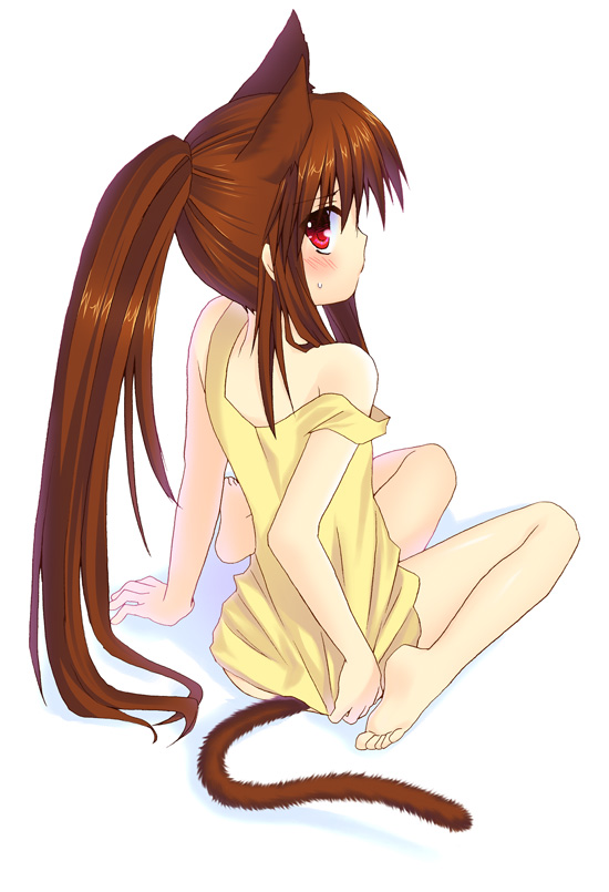 animal earsbarefootblushbottomlessbrown haircamisolecat earscat tailfeetlong hairponytailred eyessolotailvery long hair