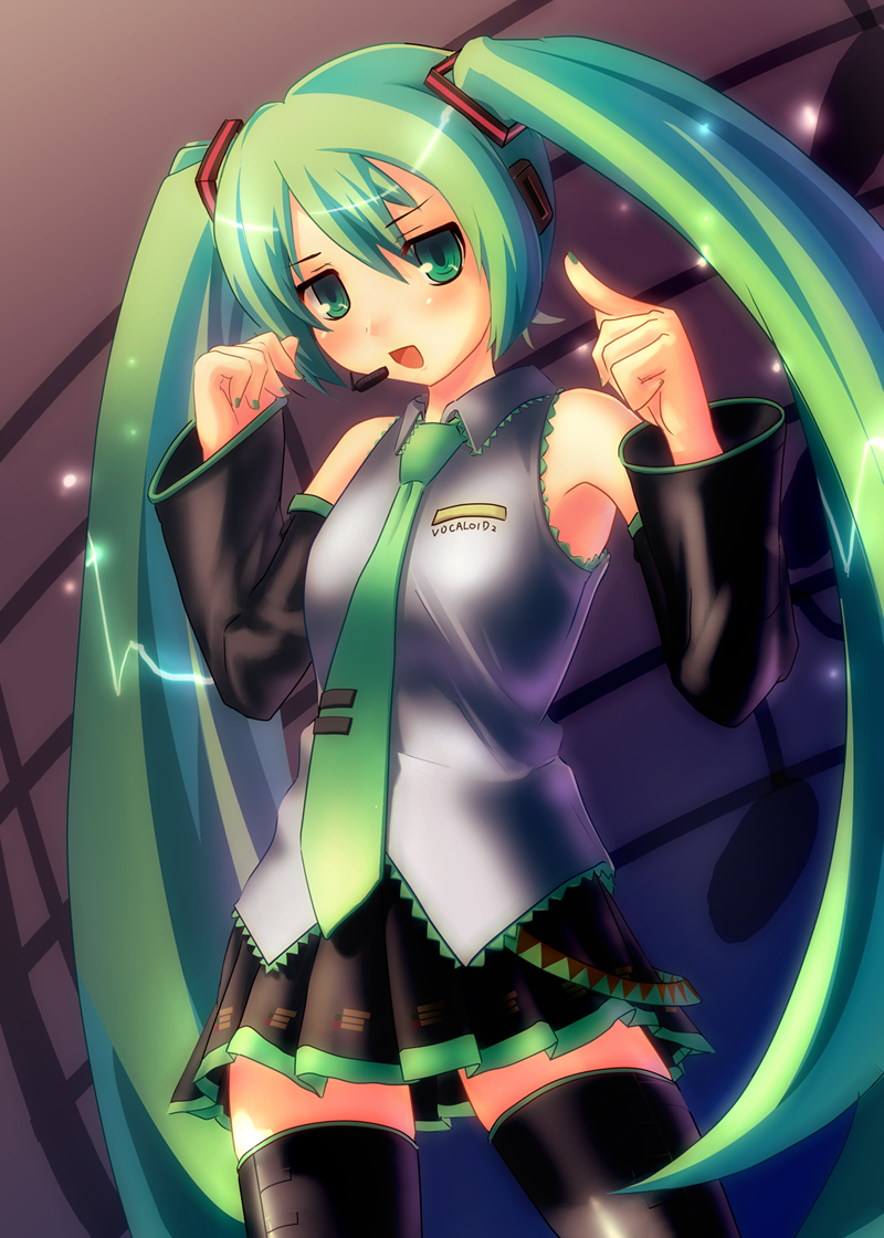 1girlarmpitsbare shouldersdetached sleevesfemale focusflat chestgreen eyesgreen hairgreen nailsheadphoneslong hairmatching hair/eyesmicrophonenail polishnecktieopen mouthskirtsolothighhighstwintailsvery long hairzettai ryouiki