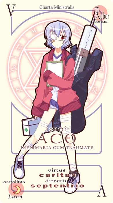 00s1girlbandagescard (medium)character nameclipboardeyepatchfemale focusfirst aid kitlarge syringeoversized objectpactiored eyesshort hairsolosyringe