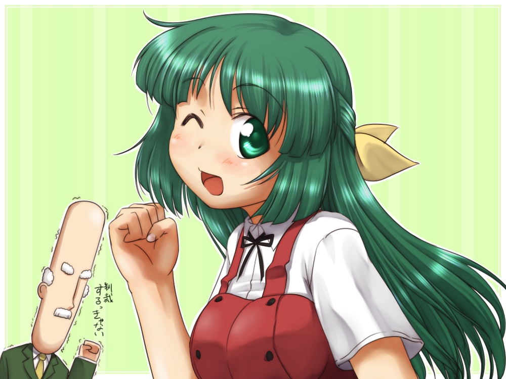 1boy1girlbaldbreastsclenched handfacial hairgensou yakyoku (style)green eyesgreen hairhair ribbonlong hairmedium breastsmustacheone eye closedparodyribbonschool uniformserafukustyle parodytext focuswinkyamabuki high school uniform