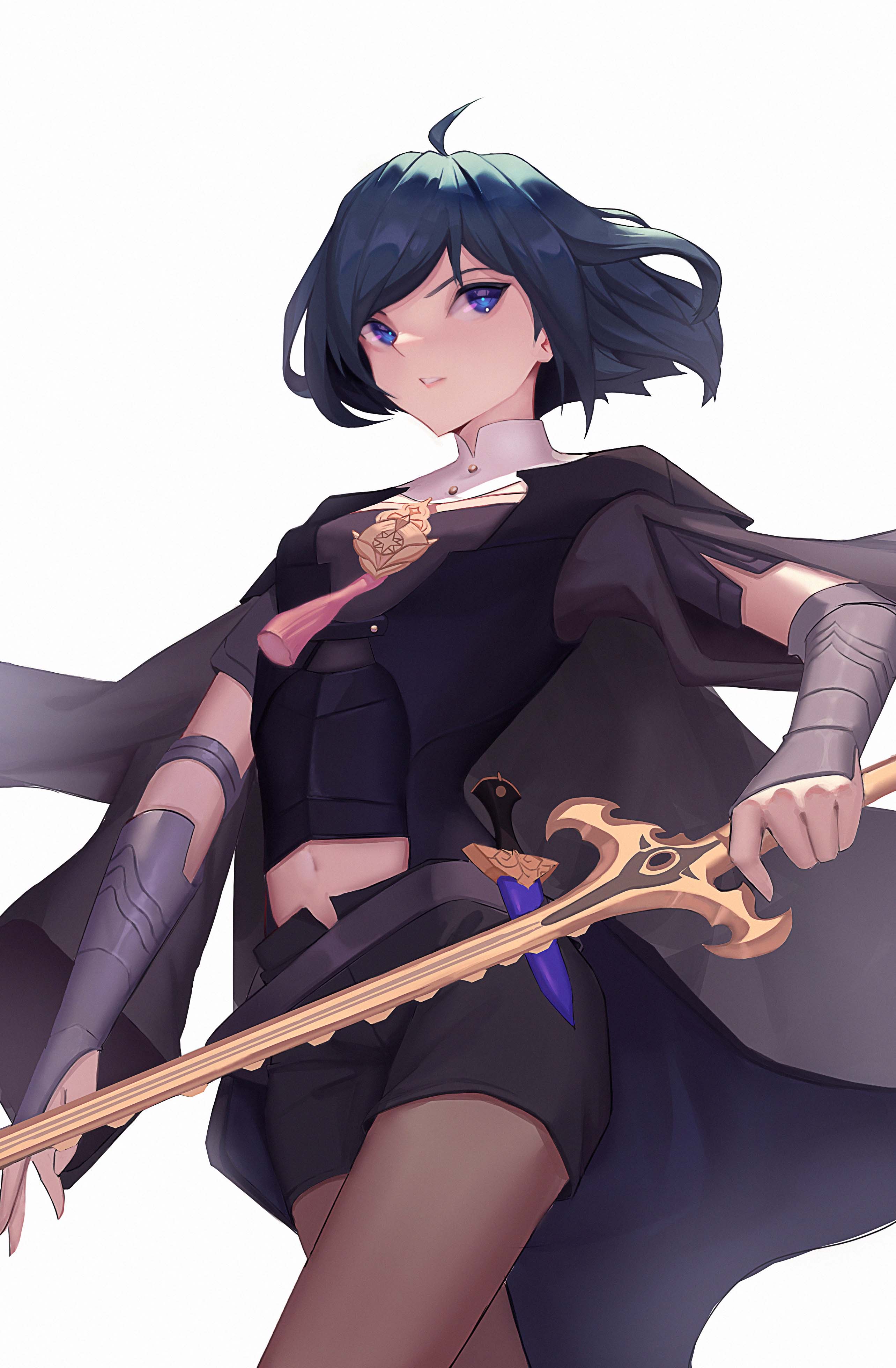 1girlahogealternate breast size (smaller)alternate hair lengthalternate hairstylearmorblack armorblue eyesblue hairbreastsgauntletshair between eyesholdingholding swordholding weaponlong hairnavelshort hairsimple backgroundsolostandingswordsword of the creatorweaponwhite background