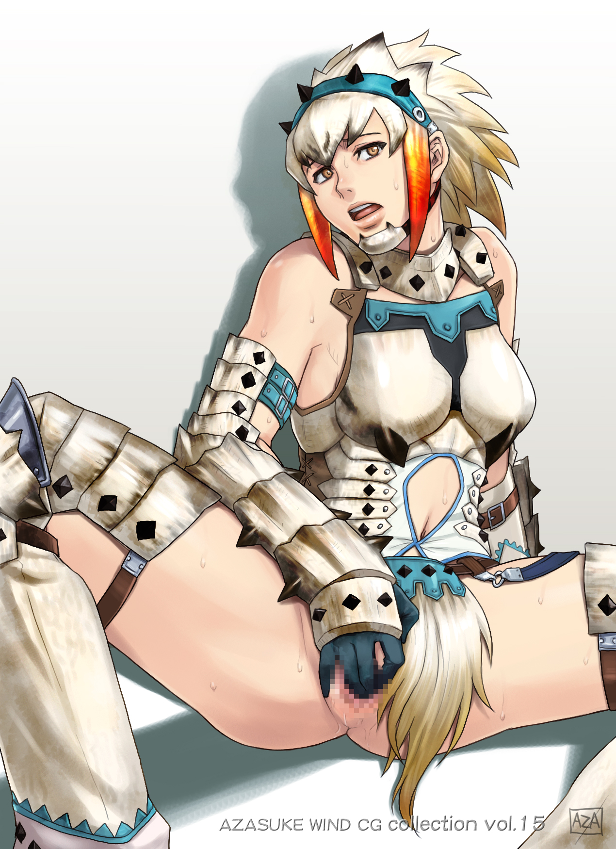 armorbare shouldersbreastsbrown eyessfemaleFlag for Deletionlooking at viewermasturbationmulticolored hairopen mouthpussyshort hairsittingsolospread legssweat