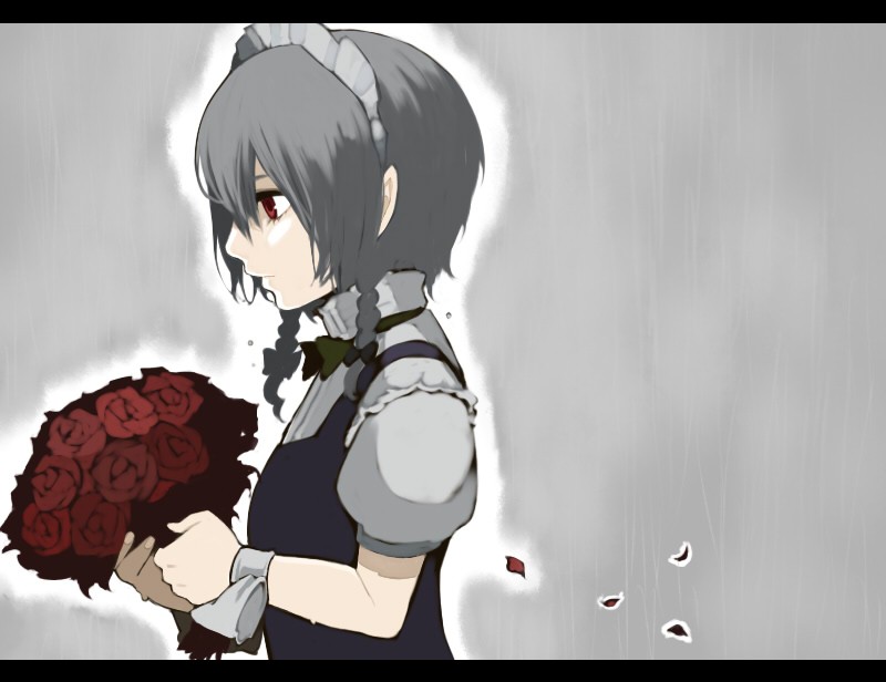 1girlbouquetbowbraidfemale focusflowerhair ribbonletterboxedmaidpetalsprofilerainred eyesribbonroseshort hairsolotwin braids