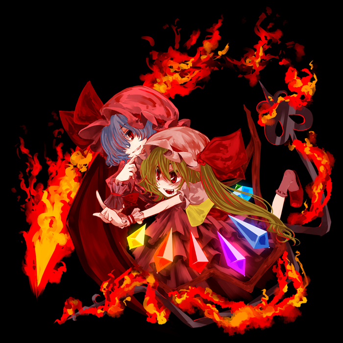 2girlsbat wingsblonde hairblue hairfemale focusfirehatmob capmultiple girlsred eyessiblingssisterswings