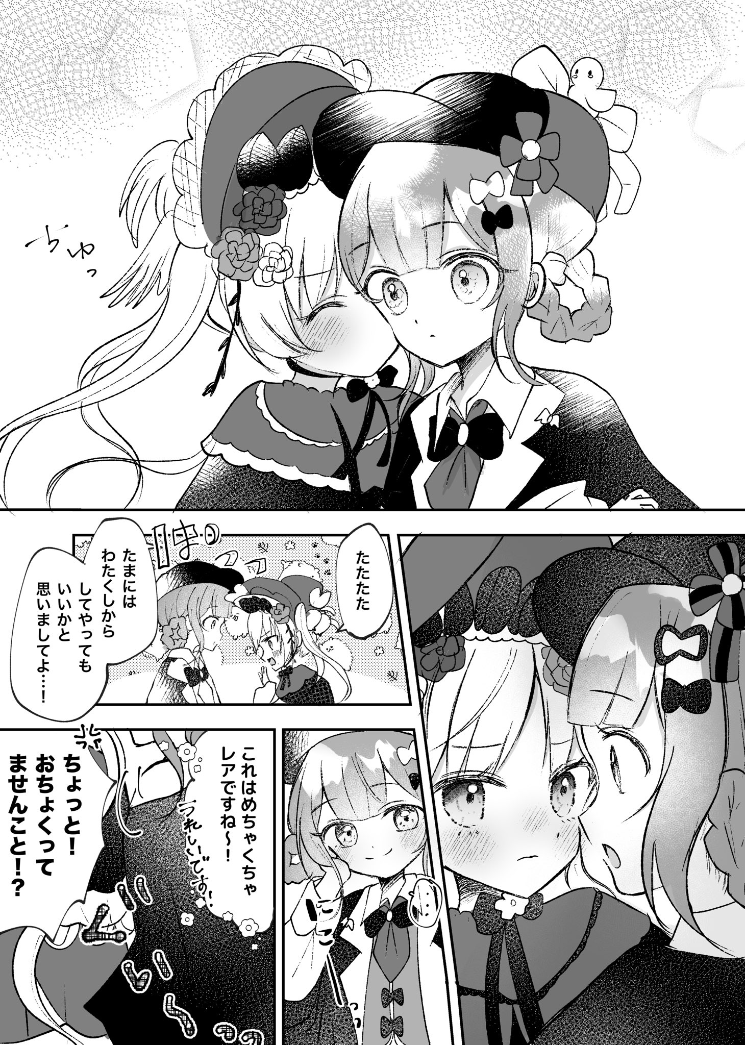 2girlsbird hat ornamentbonnetbraidbraided hair ringscapeletclosed eyesdeerstalkerdressfrilled bonnetfrilled dressfrillshair ringshatkisskissing cheekmagical girlmonochromemultiple girlsshort hairtwintailsyuri