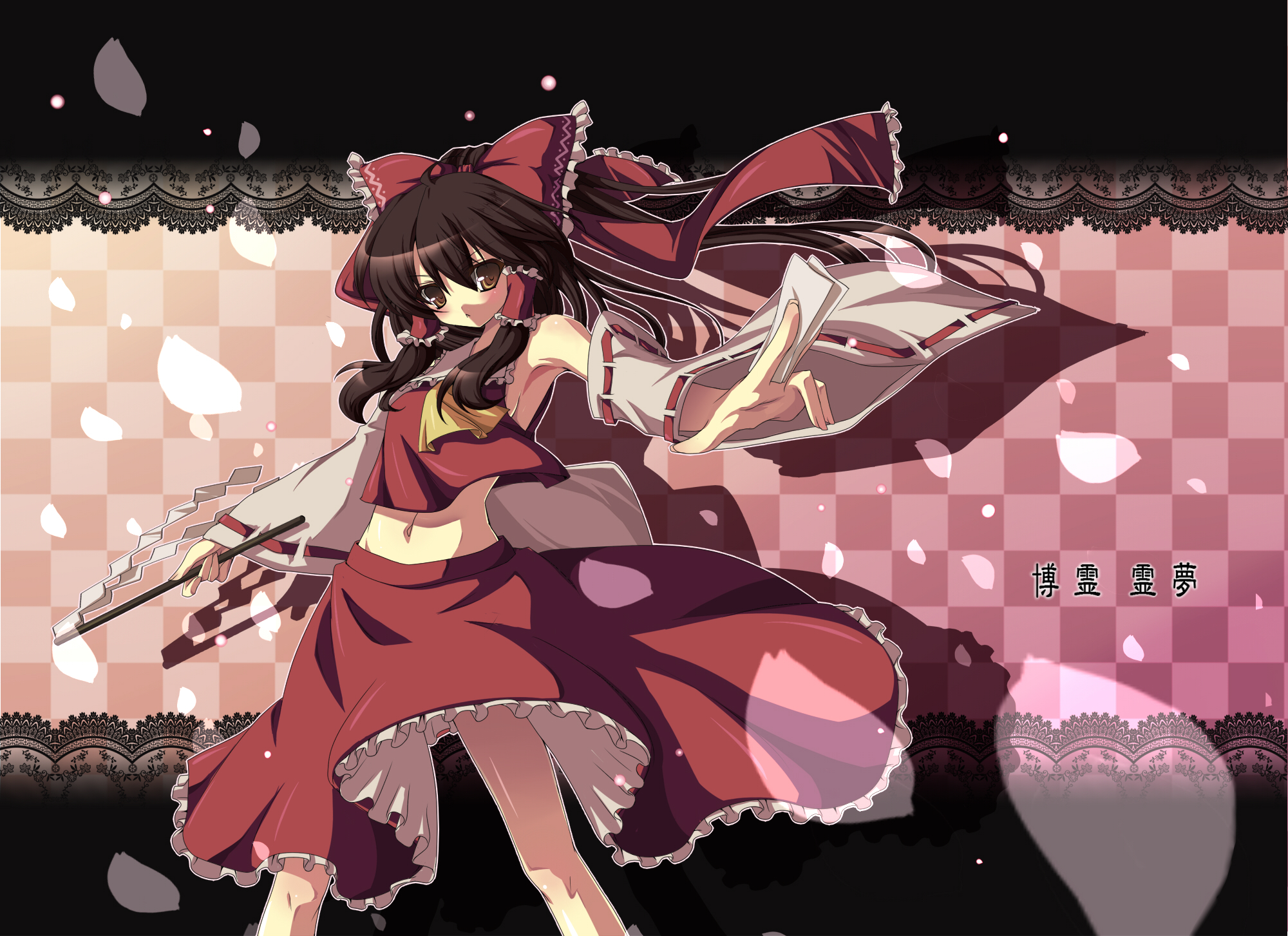 1boy1girlbowbrown eyesbrown hairdetached sleevesfemale focusgoheihair ribbonjapanese clothesmidriffmikonavelpetalsponytailribbonskirtsolo