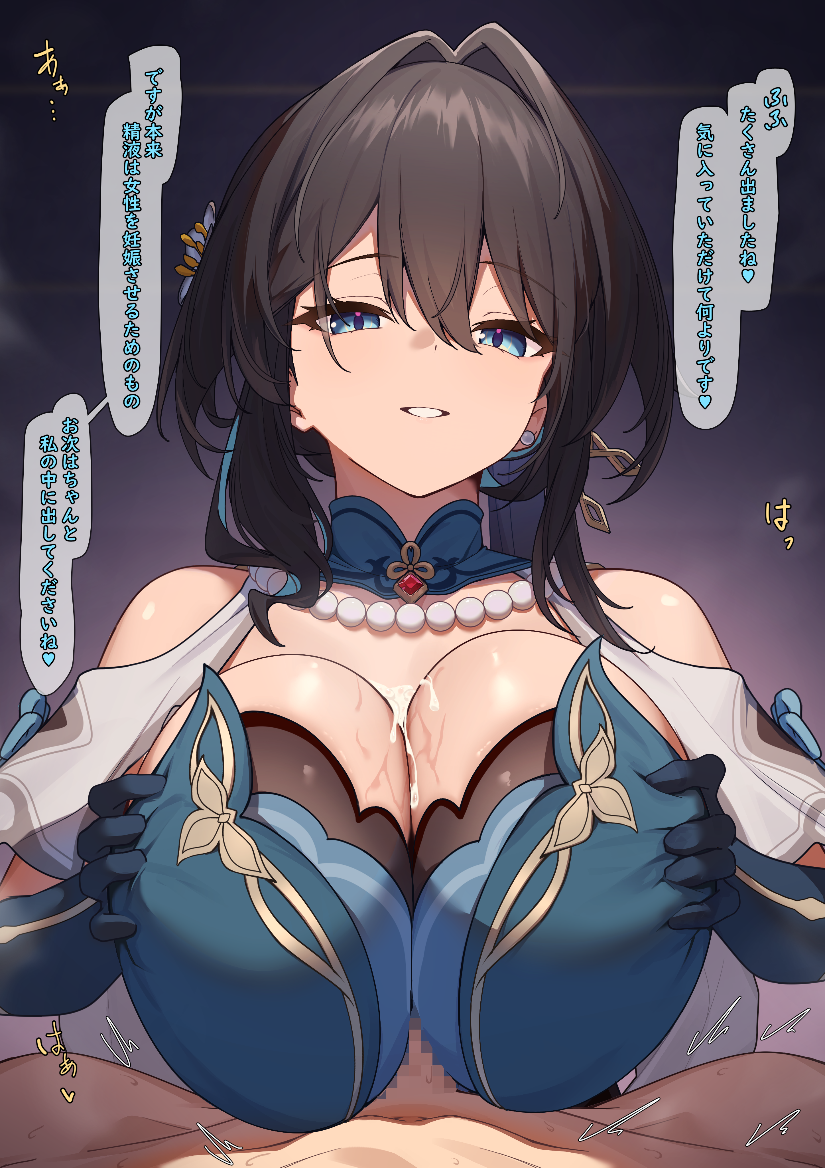 1boy1girlbare shouldersblack hairblue eyesbreastsbreasts squeezed togethercensoredcleavagecumcum on bodycum on breastscum on upper bodydetached collardresselbow glovesflowerglovesgreen dressgreen glovesgrinhair flowerhair ornamentheterojewelrylarge breastslong hairlooking at viewernecklacepaizuripearl necklacepenissmilespeech bubble