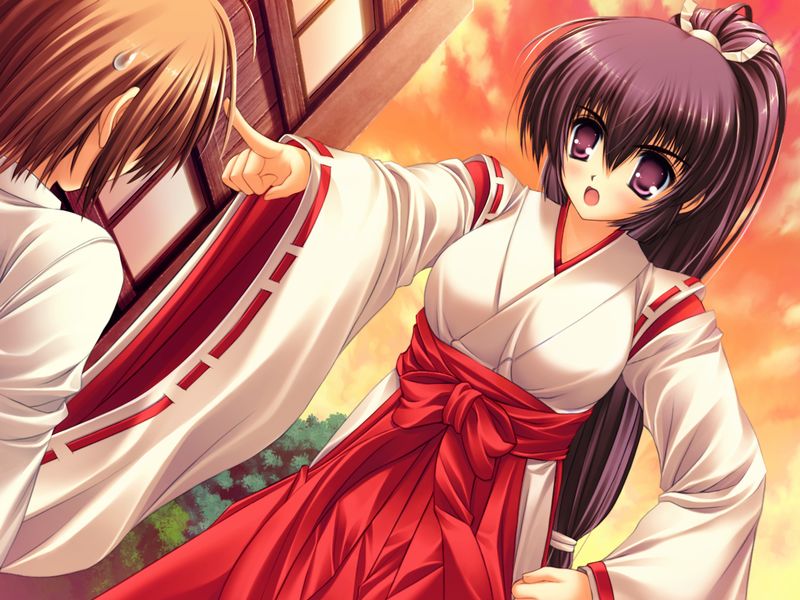 1boy1girlblack hairdutch anglehakamahakama skirtjapanese clotheslong hairmikopointingponytailpurple eyespurple hairred hakamaskirtsky