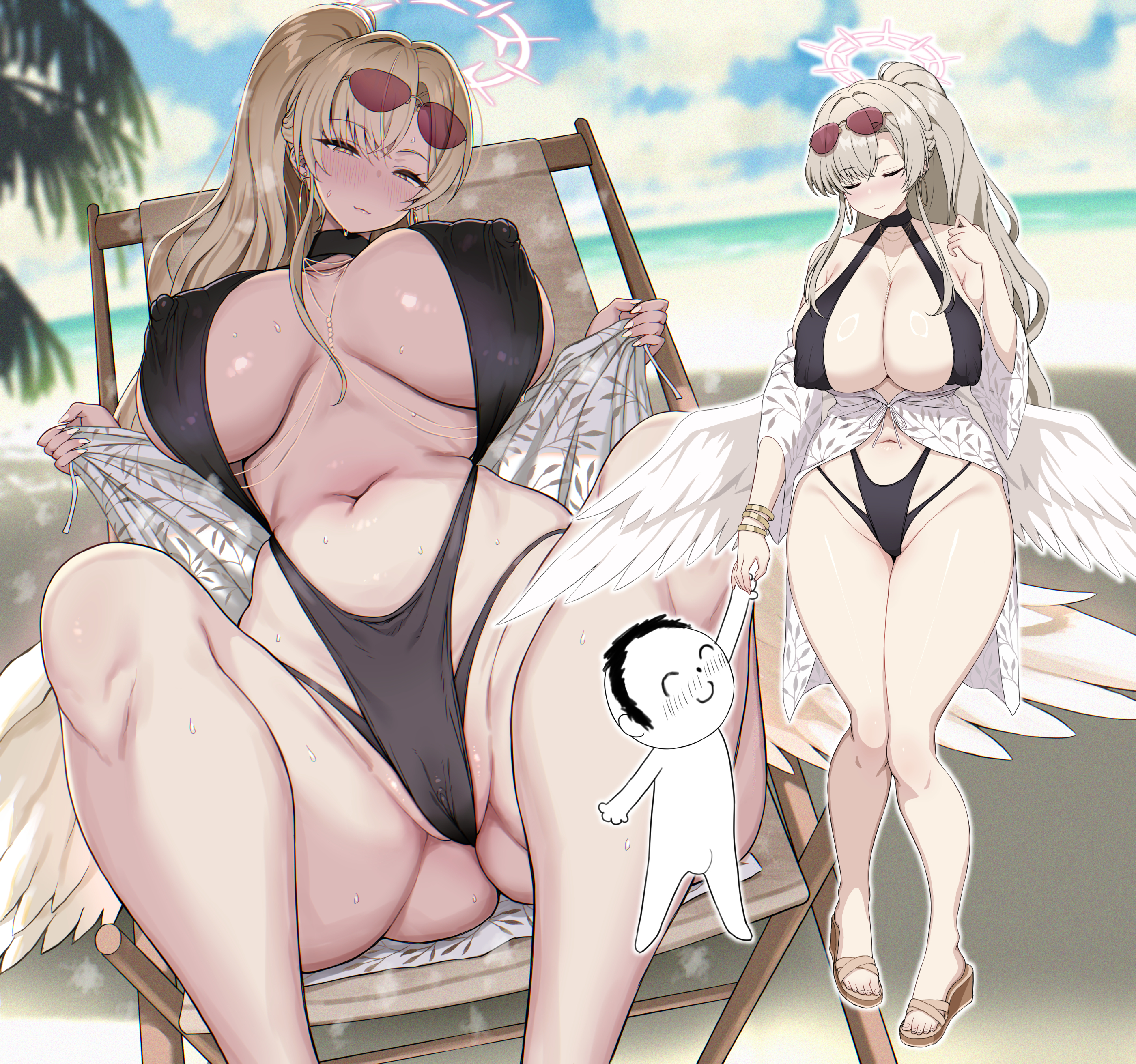 1boy1girlbare shouldersbeachblushbreastschaircovered erect nipplescurvyeyewear on headhalohighleghuge breastsjewelrylong hairmultiple viewsnavelnecklaceoff shoulderofficial alternate costumeoutdoorspresentingsandalssittingsmilespread legsstandingstomachsunglassesthick thighsthighswhite wingswings