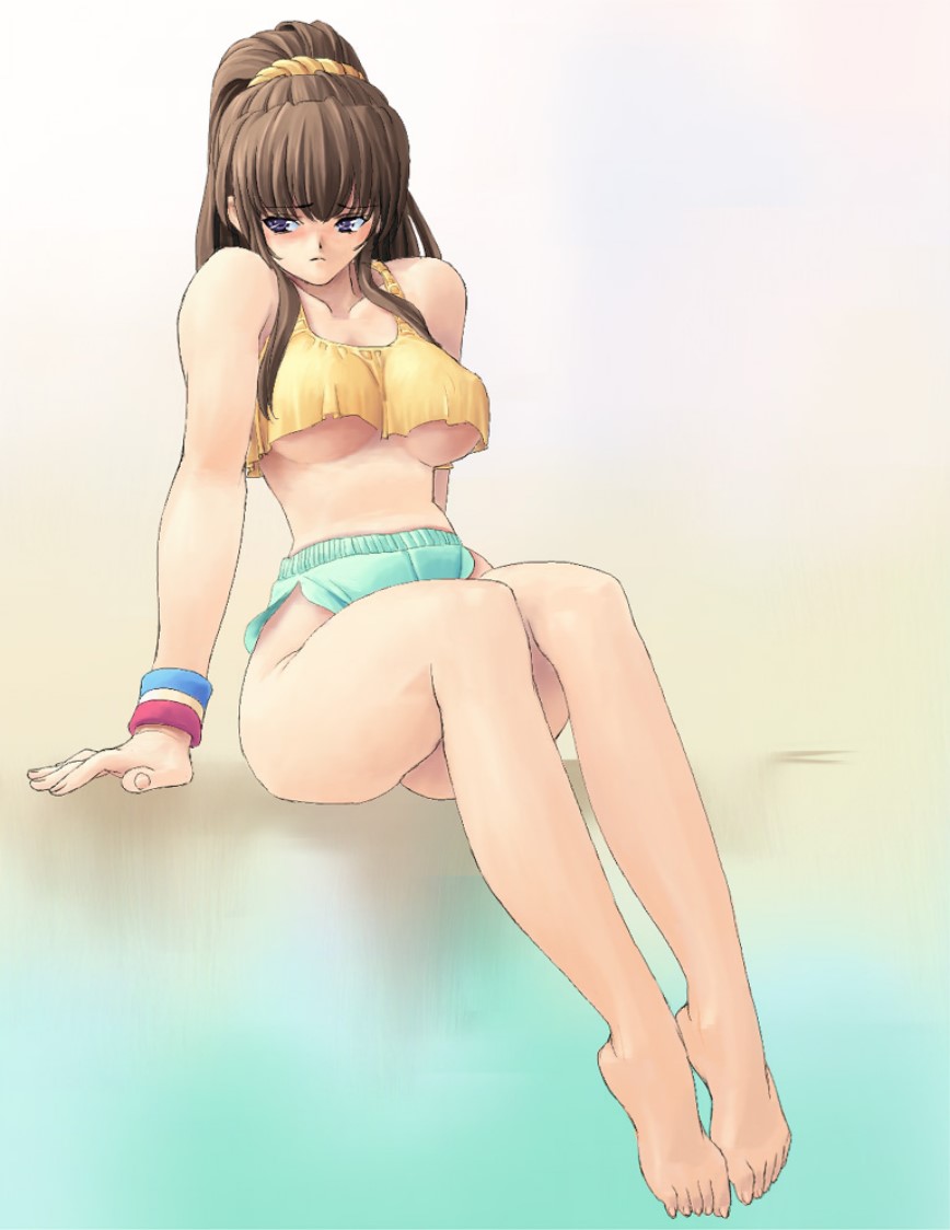 1girlbarefootblue eyesblushbreastsbrown haircrop topfemale focusflapper shirthip focuslarge breastslong hairponytailshirtshortssittingsolounderboobwide hips