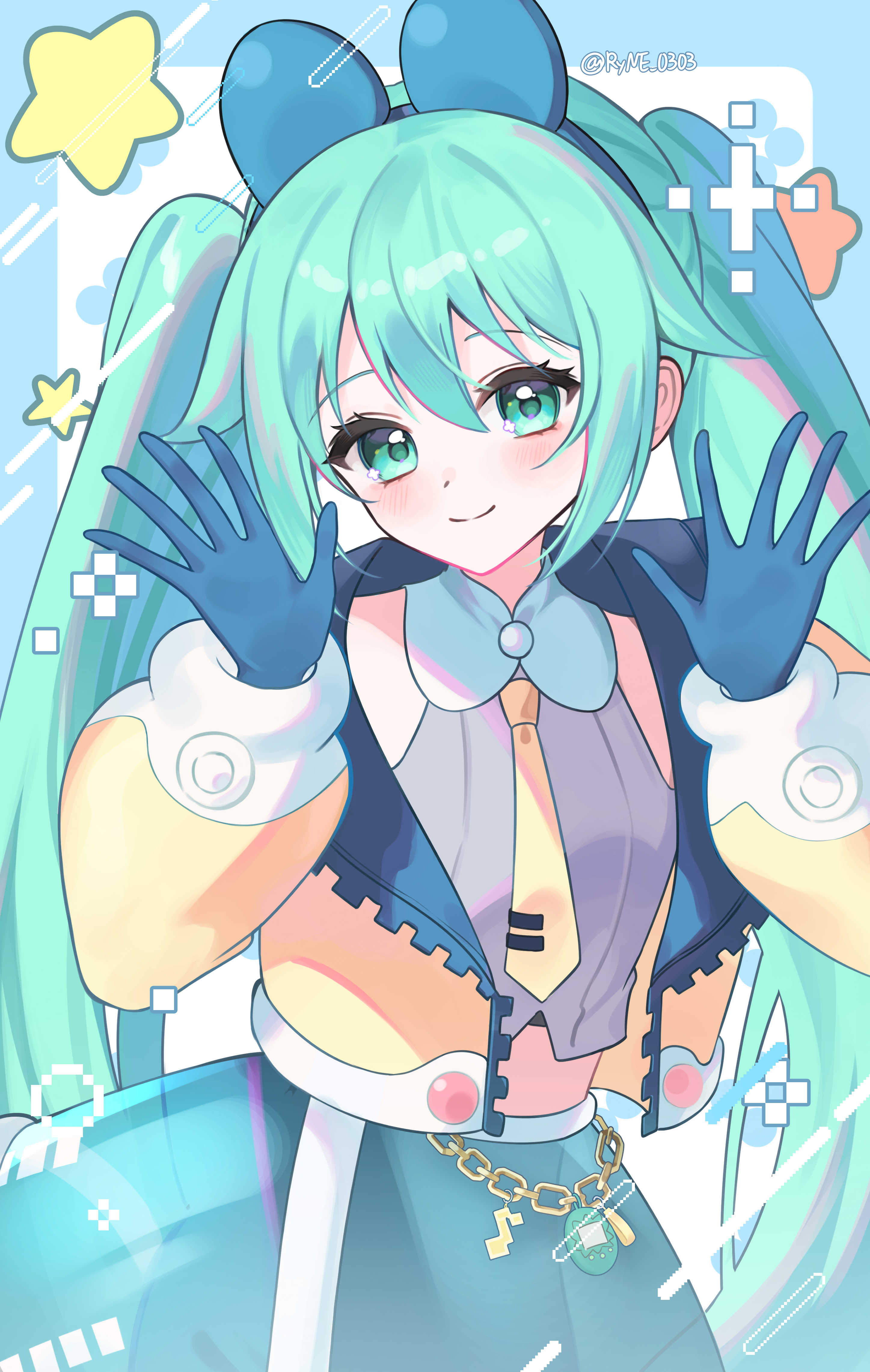 1girlblue borderblue glovesblue skirtblushborderbrown jacketclosed mouthcollared shirtcrop topglovesgreen eyesgreen hairgrey shirthair between eyeshands upjacketlong hairlong sleeveslooking at viewermidriffopen clothesopen jacketpuffy long sleevespuffy sleevesshirtskirtsleevelesssleeveless shirtsmilesolostar (symbol)tie cliptwintailstwitter usernamevery long hairwhite background
