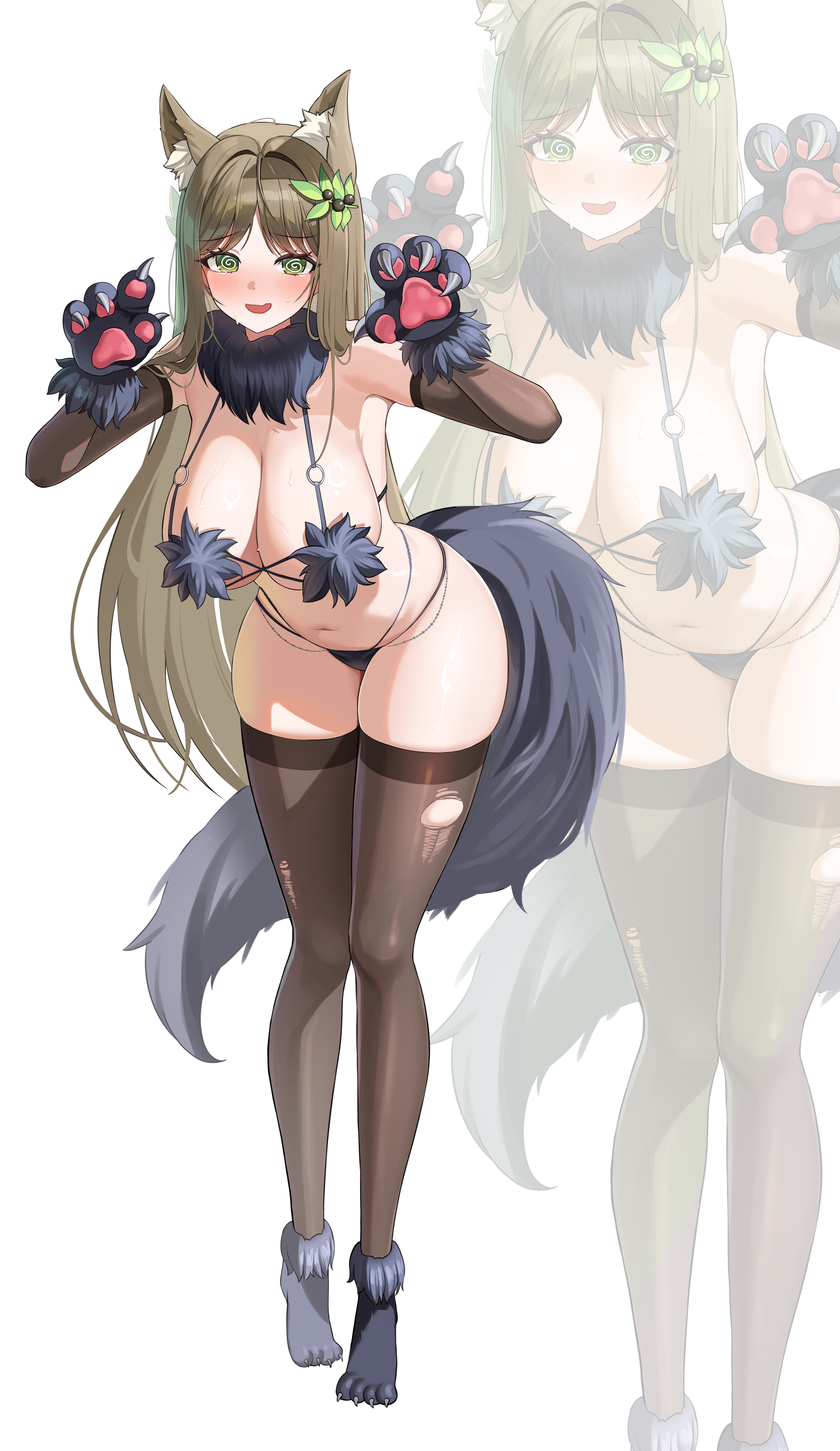 1boy1girlanimal ear fluffanimal earsanimal handsbikiniblack bikiniblack glovesblack thighhighsblushbrown hairclaw posedetached collarelbow glovesfur bikinifur collarglovesgreen eyeshair ornamentleaf hair ornamentlong hairlooking at vieweropen mouthparted bangspaw glovespawpadssoloswimsuittailthighhighs