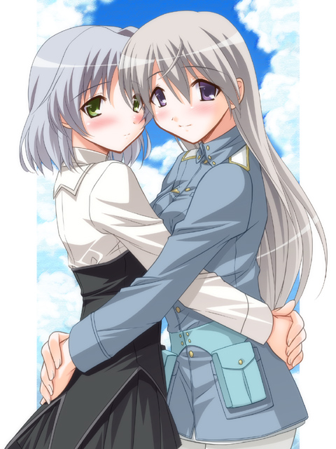 iizuki tasuku, kos-mos, t-elos, namco, xenosaga, xenosaga episode iii, wallpaper, 2girls, android, bikini, blue hair, blush, breasts, cyborg, grabbing another's breast, lingerie, long hair, multiple girls, panties, purple eyes, red eyes, short hair, side-tie panties, swimsuit, underwear, white hair, yuri