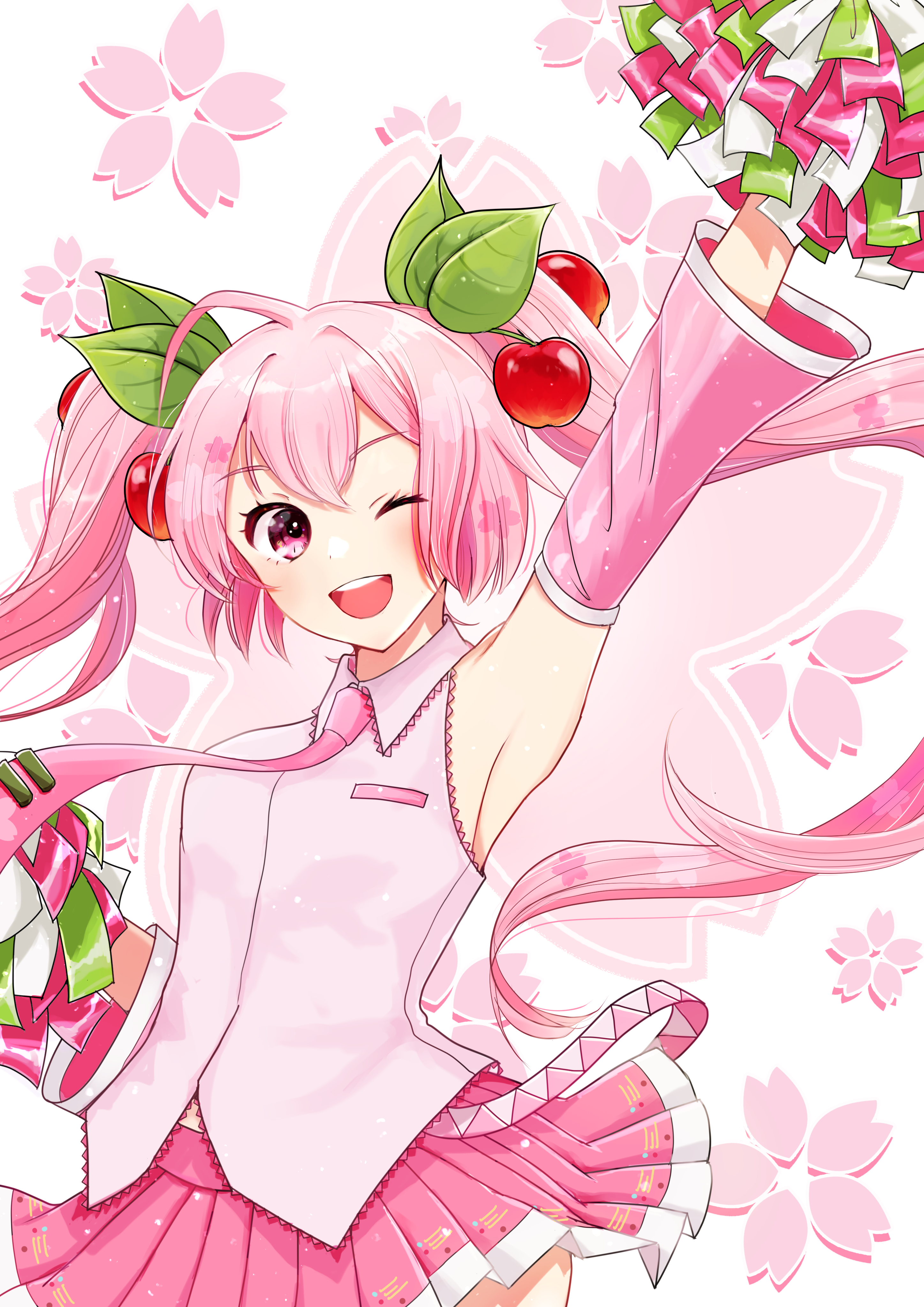 1girlahogearmpitsbreastscheeringcheerleadercherry blossom printcherry hair ornamentcollared shirtdetached sleevesfloral printfood-themed hair ornamenthair ornamentlong sleeveslooking at viewermedium breastsnecktieone eye closedopen mouthpink eyespink hairpink necktiepink shirtpink skirtpleated skirtpom pom (clothes)shirtskirtsleevelesssleeveless shirtsmilesolowide sleeves