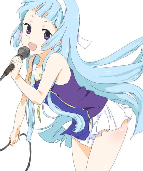 00s1girlblue hairblunt bangsfemale focushairbandlong hairmicrophonepleated skirtpurple eyesskirtsolowhite skirt
