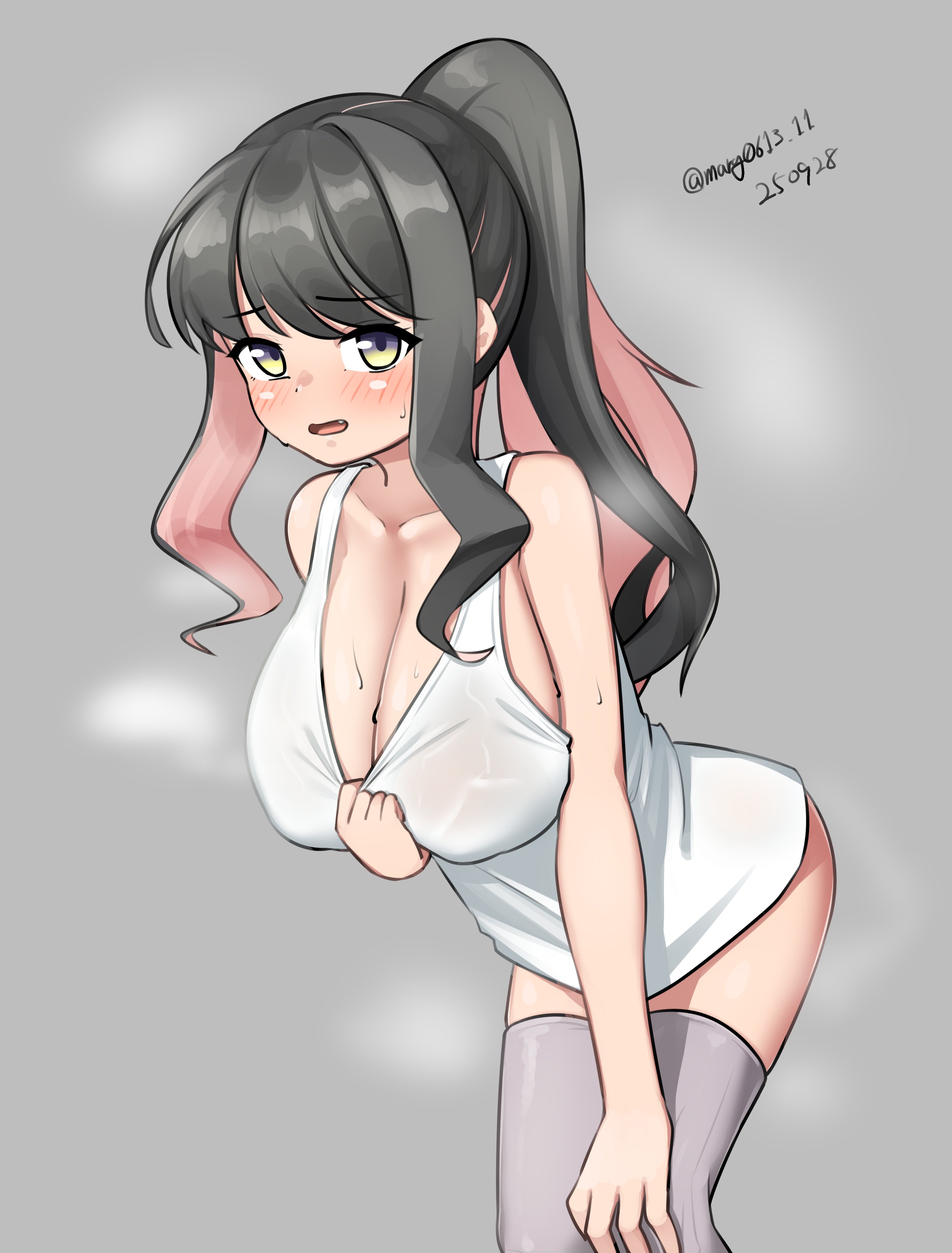 1girlalternate costumealternate hairstyleblack hairbreastscleavagedatedfeet out of framegradient eyesgrey backgroundgrey thighhighshand on own kneelarge breastsleaning forwardlooking at viewermulticolored eyespink hairponytailsimple backgroundsolosteaming bodytank topthighhighstwitter username1drawwhite tank topyellow eyes